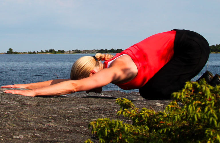 Start from a kneeling position, lean forward your upper body and reach arms forward. Place the the stomach on your knees, relax and breathe deep breaths to stretch the back muscles.